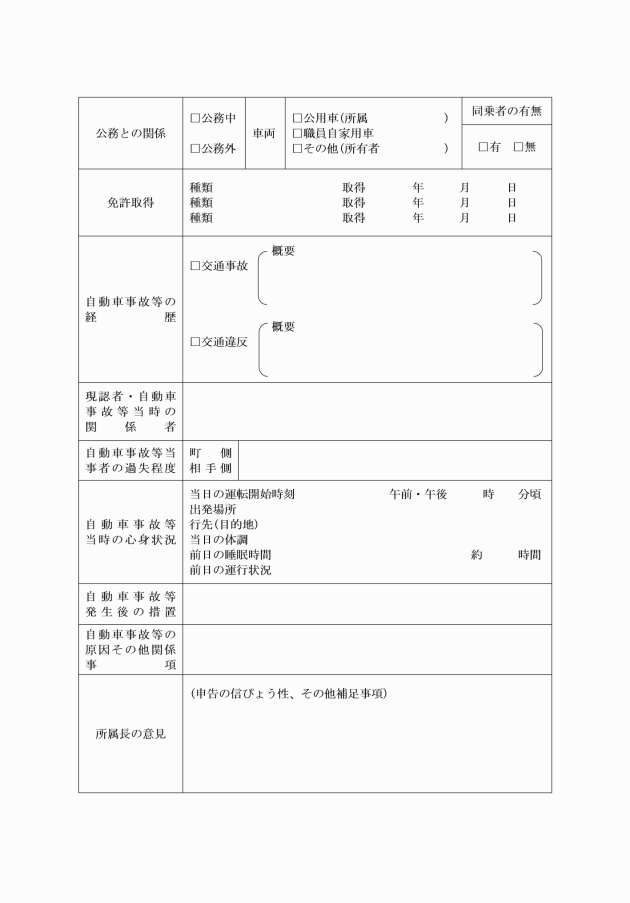 第3条 職員は、公務外における軽微違反を除き、自動車事故等を起こしたとき、又は自動車事故に遭ったときは、速やかに所属長に口頭で報告し、7日以内に自動車事故等申告書(様式第1号)を所属長に提出しなければならない。