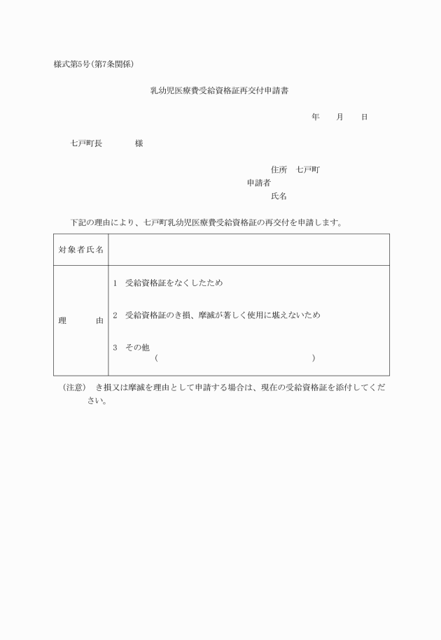 第7条 受給資格者は、受給資格証をき損し、摩滅し、又は亡失したときは、乳幼児医療費受給資格証再交付申請書(様式第5号)を町長に提出して、その再交付を申請することができる。