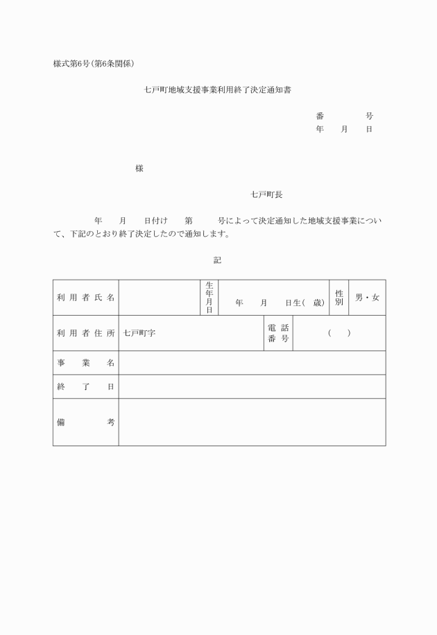 第6条 事業利用決定後において、サービスの内容に変更が認められる場合若しくは利用者が死亡又はその他の事由により事業利用について終了する意思があったときは、利用者又はその家族等は、速やかに七戸町地域支援事業利用申請書(様式第1号)又は七戸町地域支援事業利用終了届(様式第5号)を町長に提出するものとする。