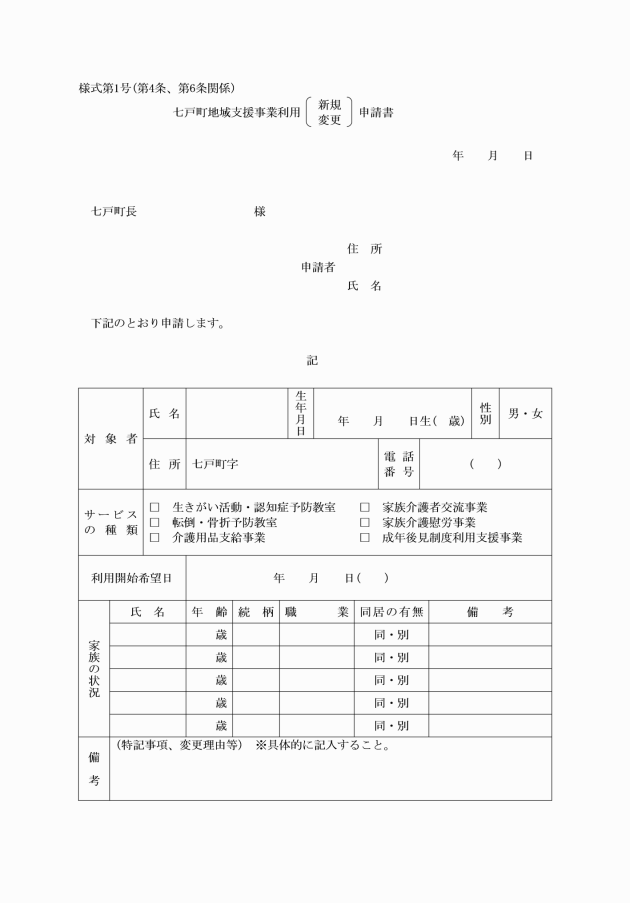 第4条 この事業を利用しようとする場合、本人又はその家族は、七戸町地域支援事業利用申請書(様式第1号)を町長に提出するものとする。