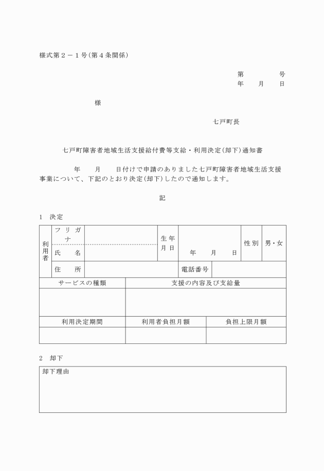 2) 利用決定し、交付した七戸町障害者地域生活支援給付費等支給・利用決定通知書(第3条第12号関係様式第2―1号)をもって利用者証とし、支給量の範囲内において直接事業者に申し込みを行い、サービスを利用する。