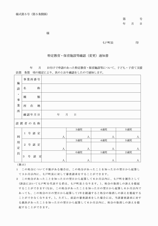 第7条 町長は、法第40条第1項又は第52条第1項の規定による確認の取消し又は停止をしたときは、特定教育・保育施設等確認取消(停止)通知書(様式第7号)により通知するものとする。
