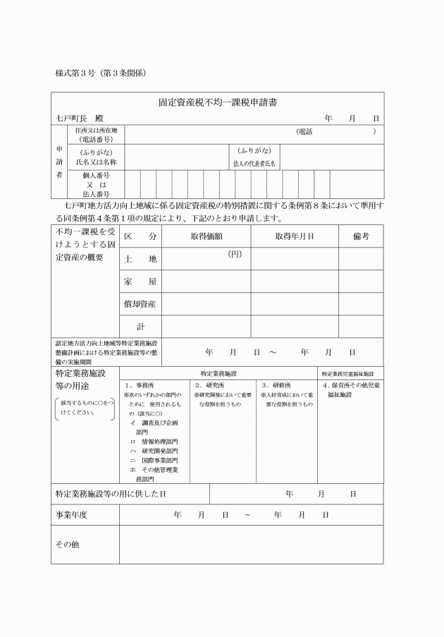 第3条 条例第8条において準用する条例第4条第1項の申請書は、固定資産税不均一課税申請書(様式第3号)によるものとする。
