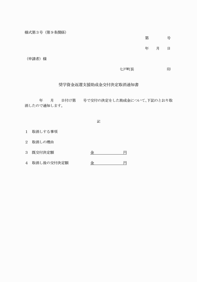 第7条 助成金の交付を受けようとする者は、返還支援の要件を満たした日の属する年度の翌年度に、奨学資金返還支援助成金交付申請書(様式第1号)により、町長に申請しなければならない。